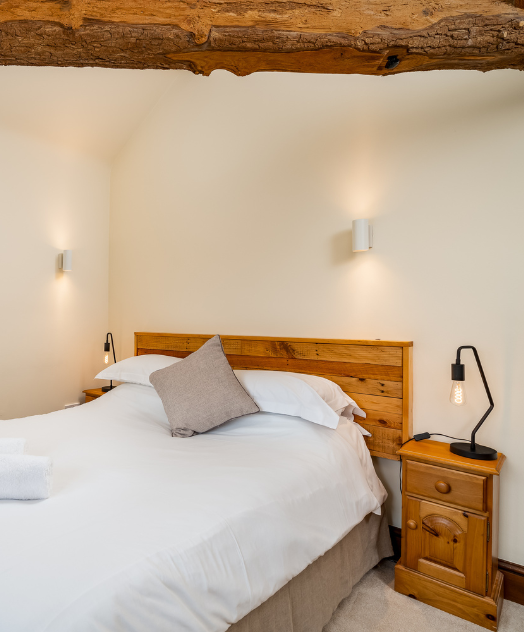 Stone barn walls and rustic beams bring character to the second bedroom. The bedroom offers ample space and comfort, featuring a double bed and private ensuite bathroom.